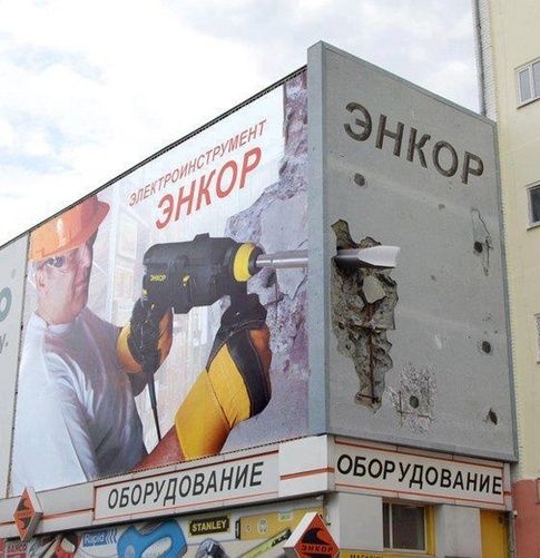 Der Bohrer auf dem Plakat der auf der Seite des Gebäudes herausragt, der Mund der geöffnet ist und somit die Tunnelöffnung darstellt.